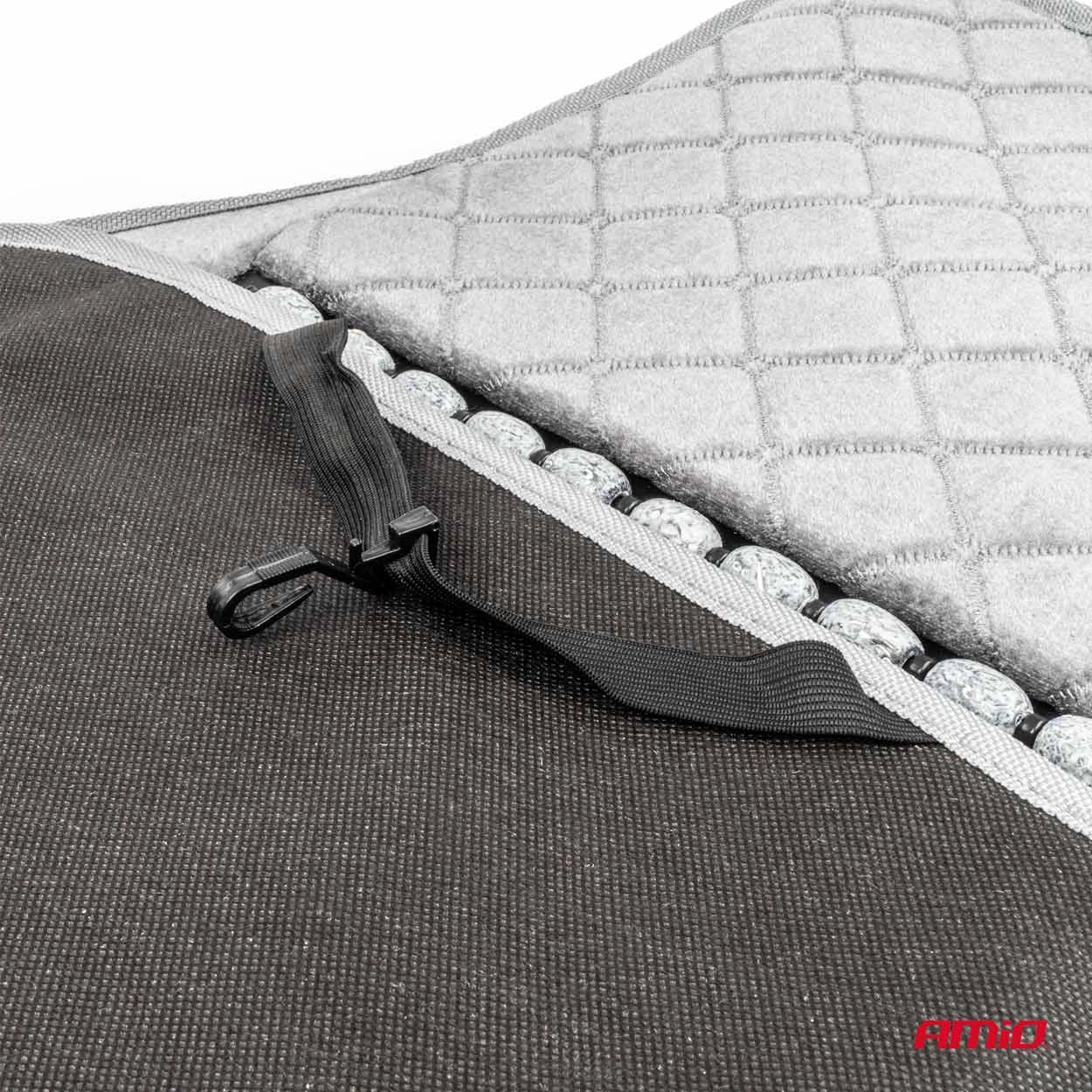 Universalūs matmenys (45 x 120 cm) leidžia kilimėliui tinka daugumai lengvųjų automobilių, mikroautobusų ir sunkvežimių sėdynių. Elastiniai tvirtinimo dirželiai neleidžia kilimėliui pasislinkti vairuojant, užtikrindami stabilumą ir komfortą.