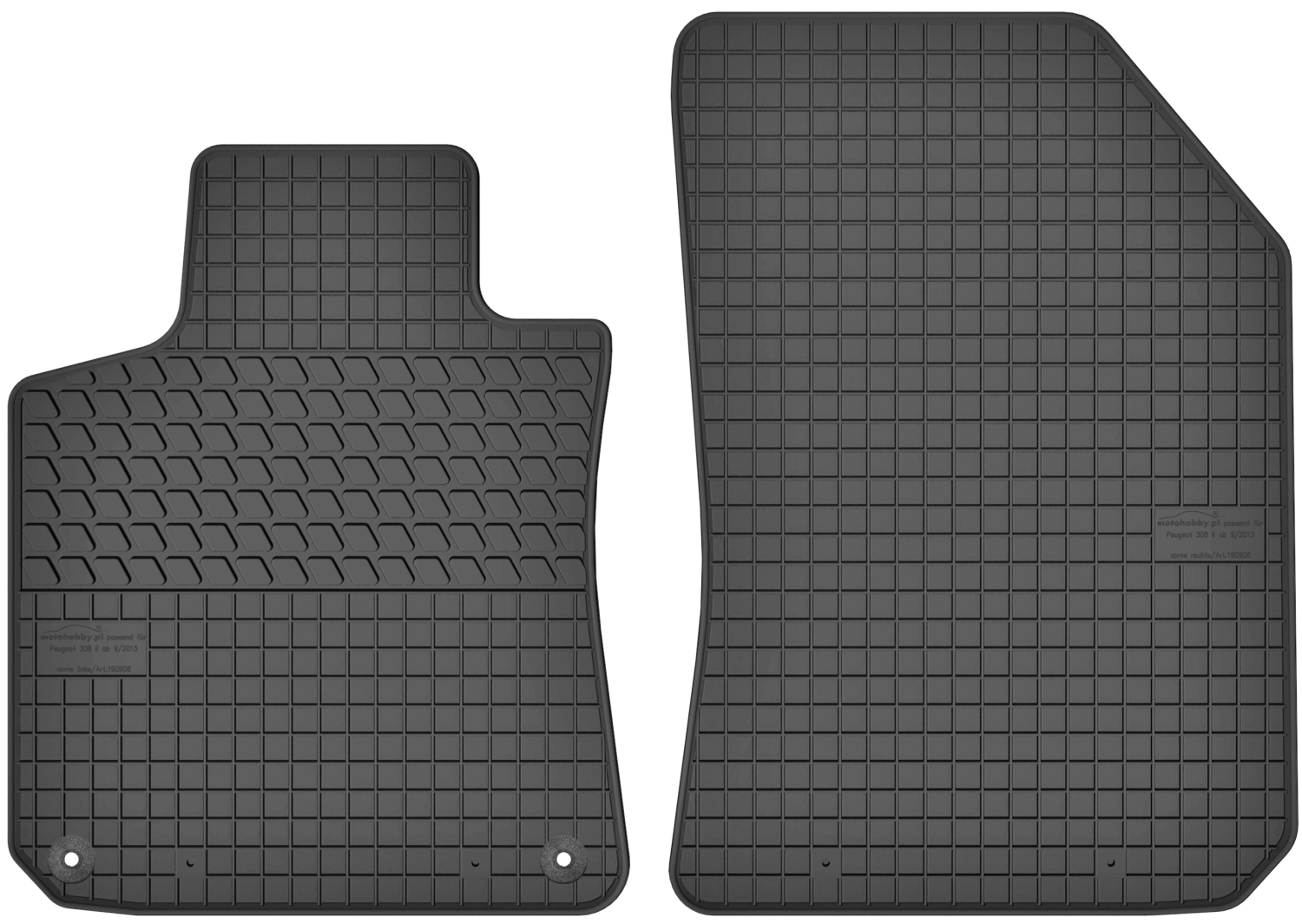 MOTOHOBBY kilimėliai yra pagaminti iš aukštos kokybės gumos mišinio, kurio dėka jie neskleidžia gumos kvapo ir yra atsparūs trinčiai. Kilimėliai pagaminti specialiai pagal automobilio modelį, todėl dera ant Jūsų automobilio grindų. Iš apačios kilimėliai padengti papildomais išsikišimais (spygliukais), kurie efektyviai apsaugo kilimėlius nuo slydimo, o tai ženkliai pagerina vairavimo komfortą. Vairuotojo kilimėlis turi papildomą sutvirtinimą, kuris apsaugo kilimėlį nuo trinties po kulnais ant pedalo linijos.