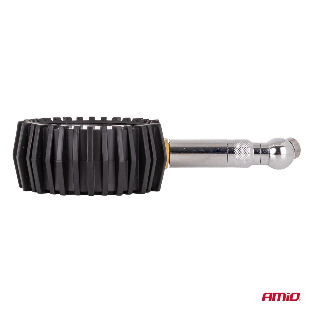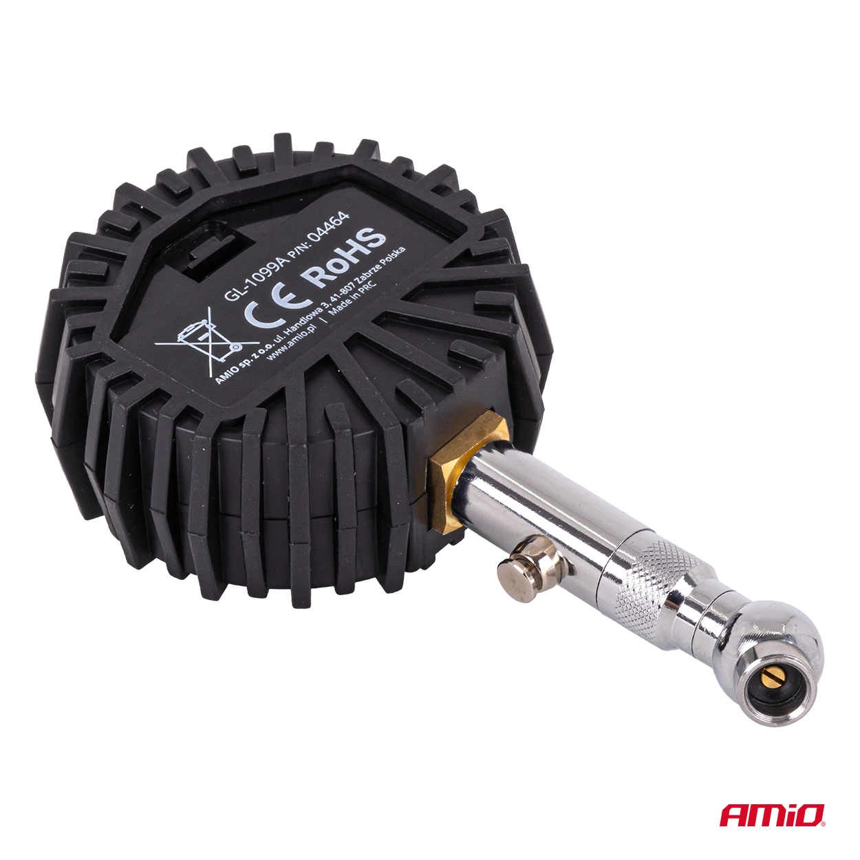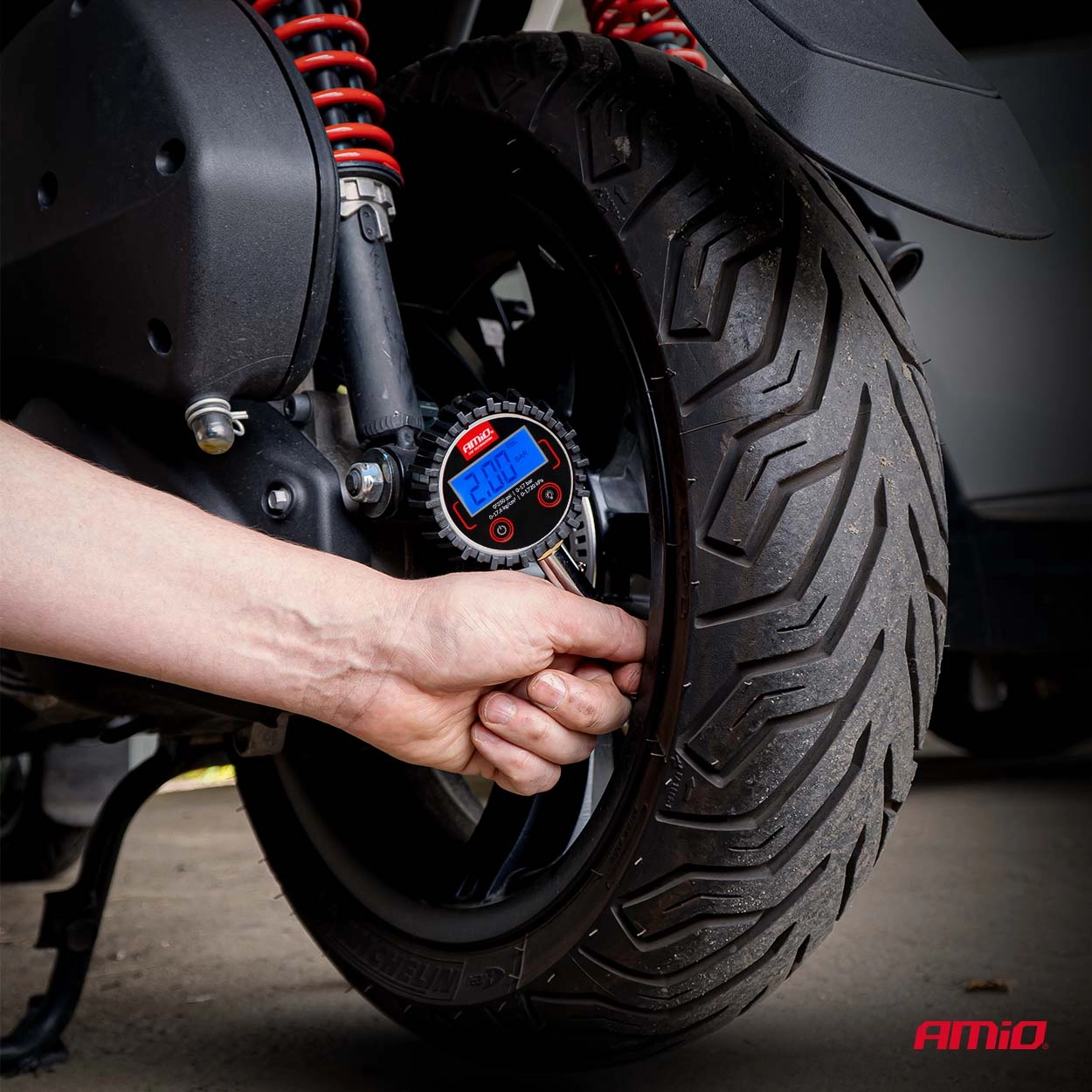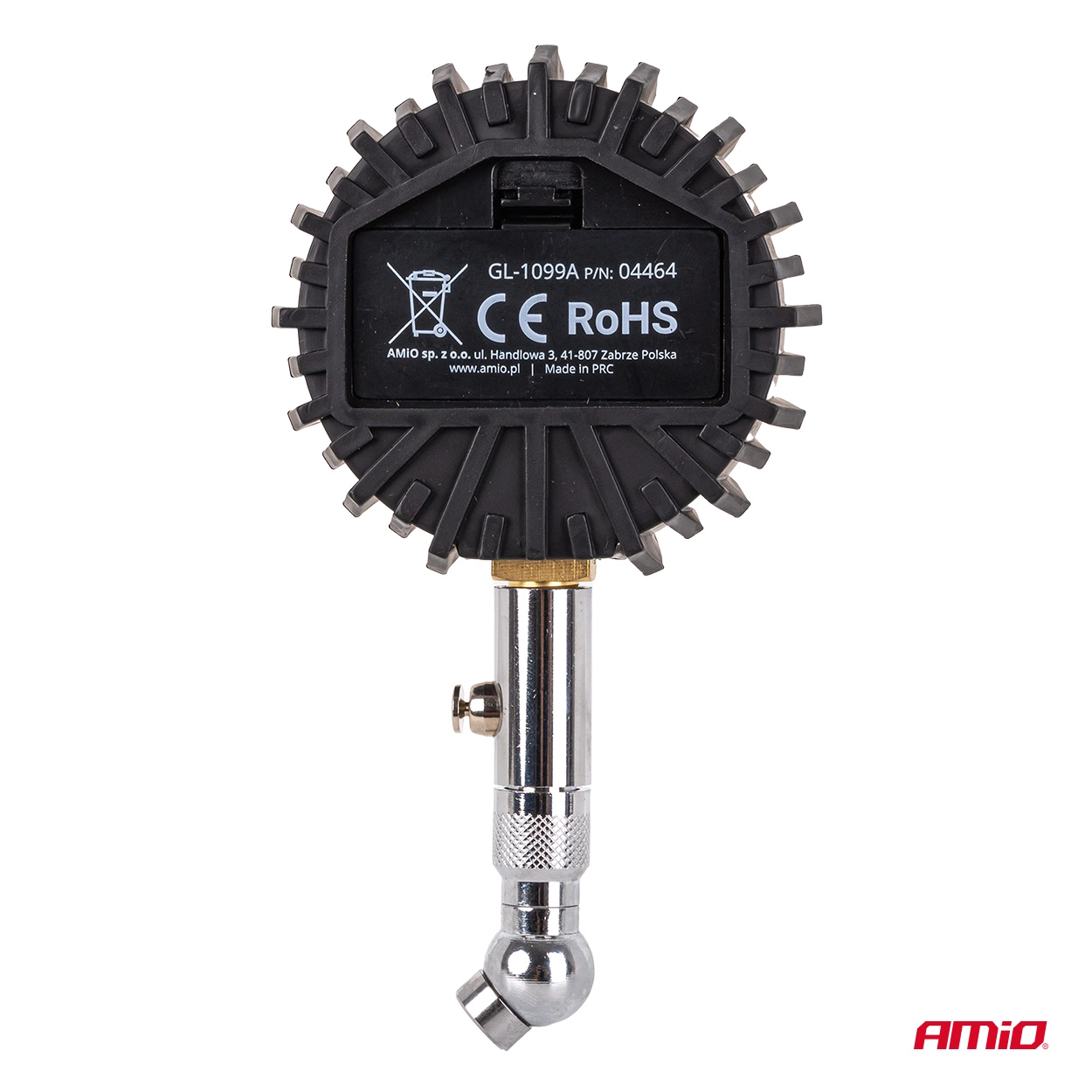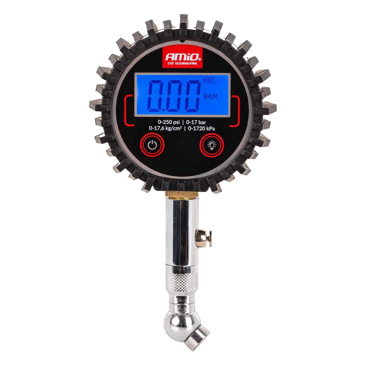 Šis skaitmeninis padangų slėgio matuoklis su besisukančia galvute ir atstatymo vožtuvu yra profesionalus įrankis, skirtas padangų slėgiui tikrinti. Įrengtas skaitmeninis ekranas, jis garantuoja tikslius ir greitus matavimus iki 17 barų. Besisukanti galvutė leidžia patogiai pasiekti vožtuvus sunkiai pasiekiamose vietose, o slėgio išleidimo vožtuvas leidžia lengvai reguliuoti slėgį neišimant matuoklio.