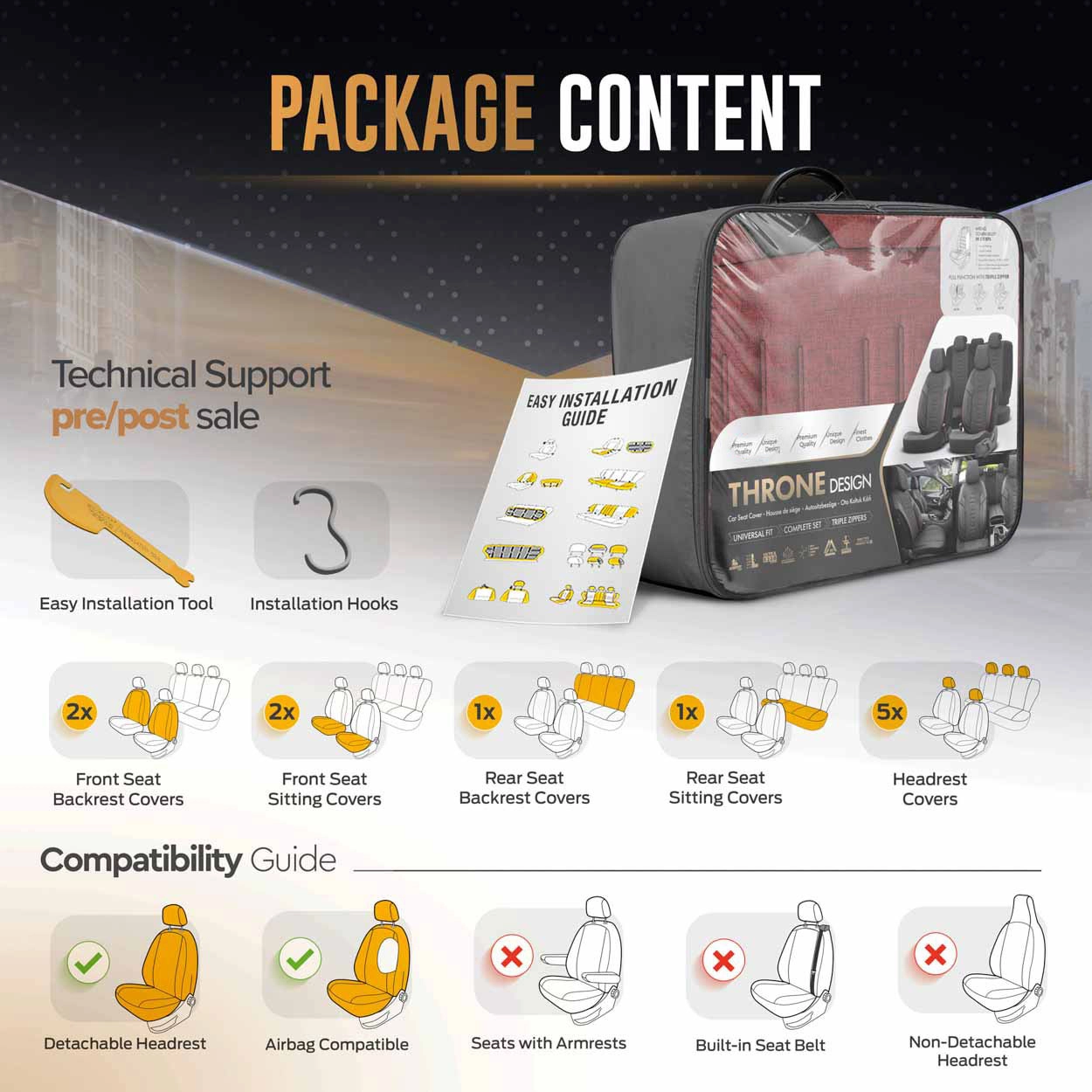Aukščiausios kokybės, universalus, sėdynių užvalkalų komplektas. Speciali dizaino forma, kartu su lanksčia medžiaga užtikrina optimalų tinkamumą su visų tipu automobiliais. Šie užvalkalai užtikrina maksimalią apsaugą, jūsų originalioms sėdynėm. Tai geriausias sprendimas norint išvengti purvo, dėmių ir nusidėvėjimo ant jūsų originalių sėdynių.